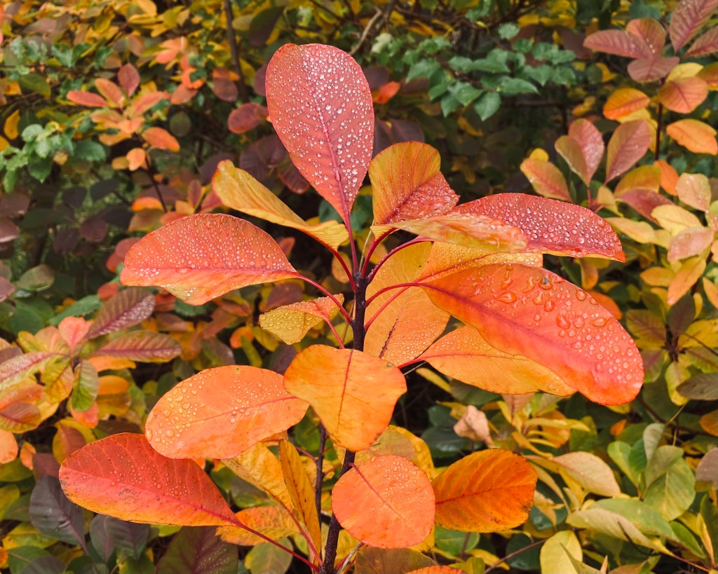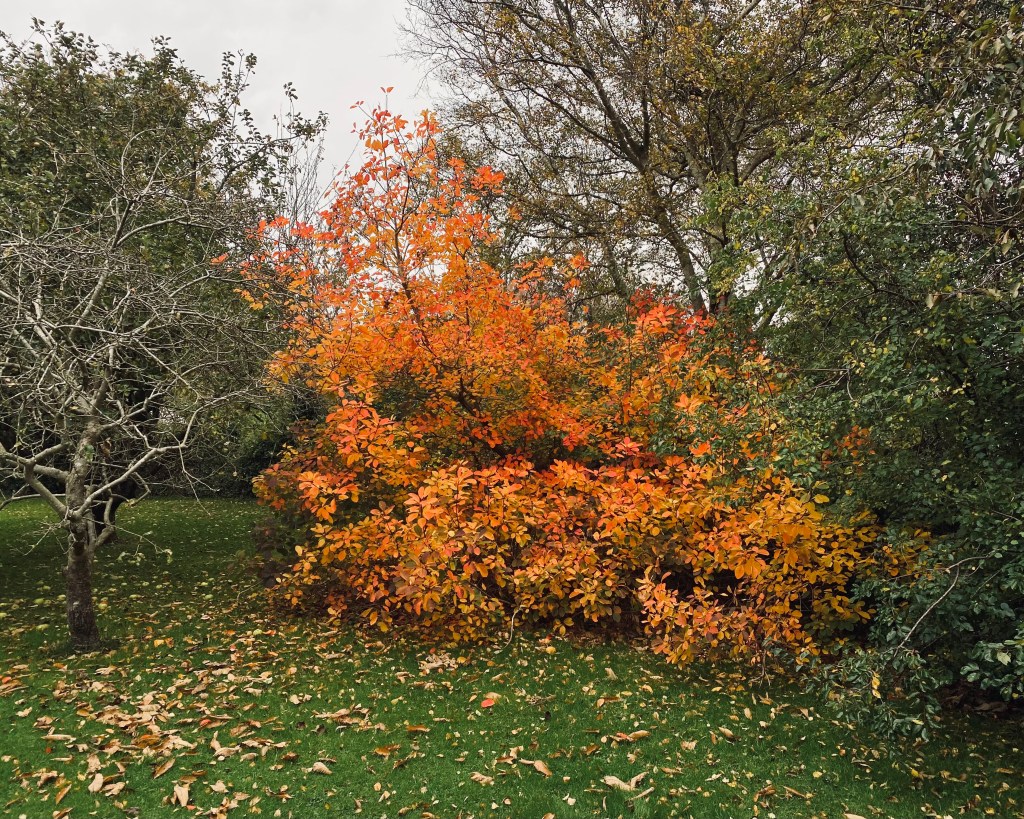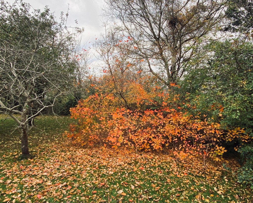 The autumn leaf colour of the Smoke Bush is reliably spectacular and for this alone the plant deserves however much space it takes up. The specimen pictured has had no real care or input, it was planted and there it exists. However, you can manipulate these shrubs quite easily through hard annual (winter) pruning to throw out long straight growths that tend to have a larger leaf size than if it were left alone or merely clipped over whenever you get round to it. The larger leaf is a bonus especially in the purple leaved variety for this is a shrub grown for foliage over flowers, so this action maximises its main attribute. In deploying this technique I lose the flowering and the ‘smoke’ effect, but no big deal, once November arrives my head is turned and still I can’t quite believe it. Like all things, it has its season.
