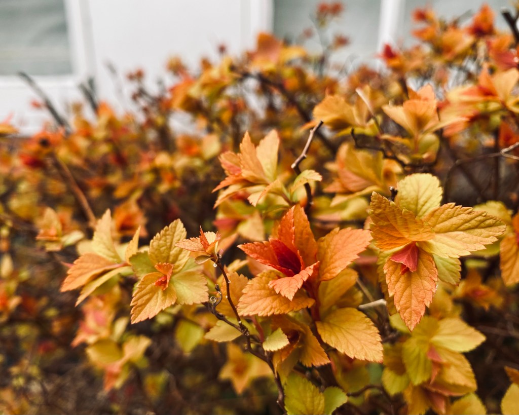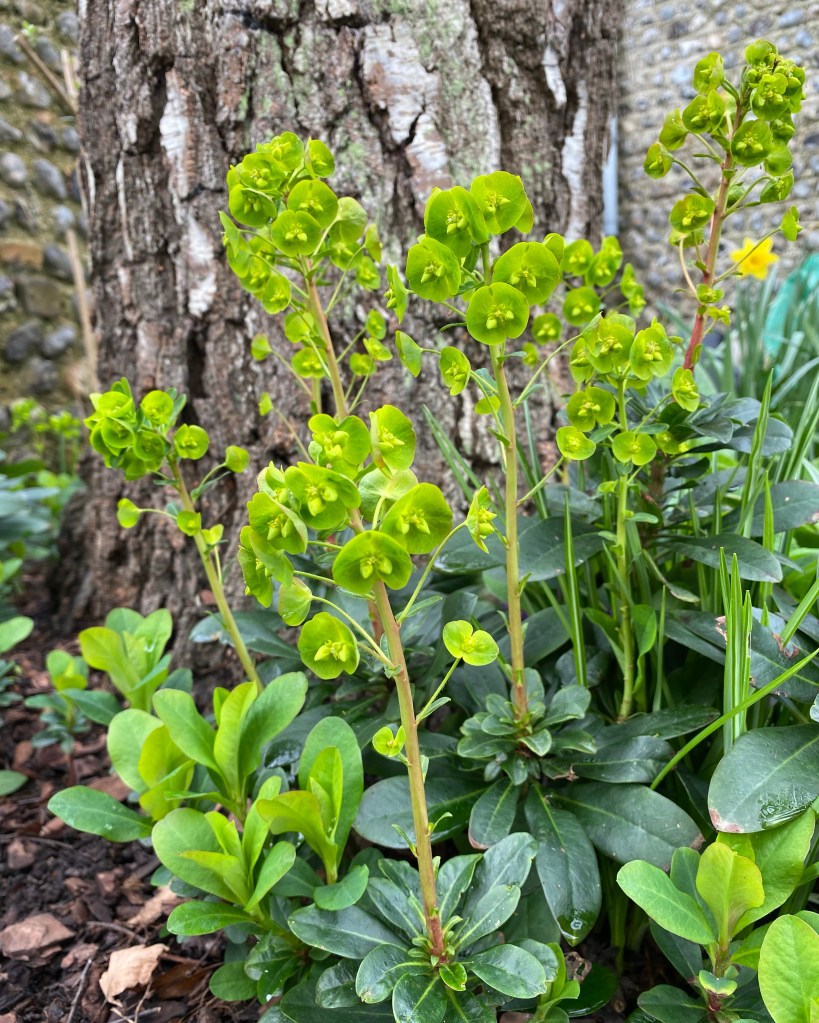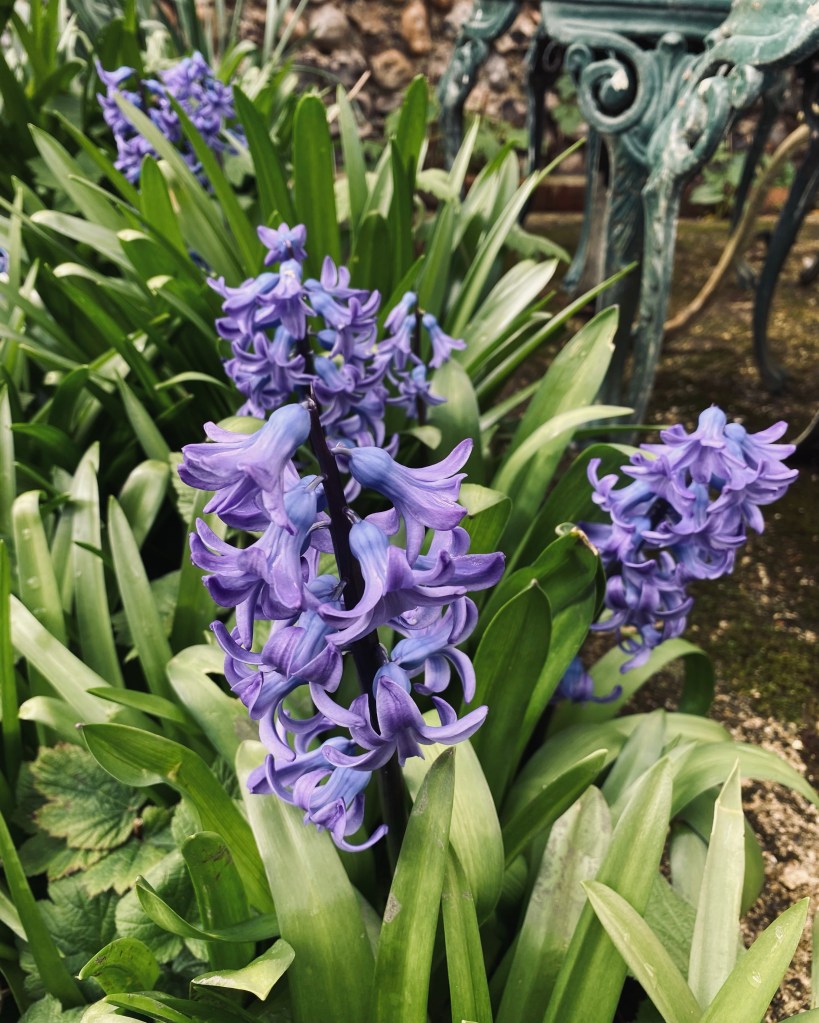 Spirea japonica ‘Goldflame’, colourful as new leaves appear after dormancy followed by Euphorbia robbiae flowering now, and lastly Hyacinthus orientalis ‘Delft Blue’ which is not long lasting but has extraordinary scent thus familiar inside the house also.