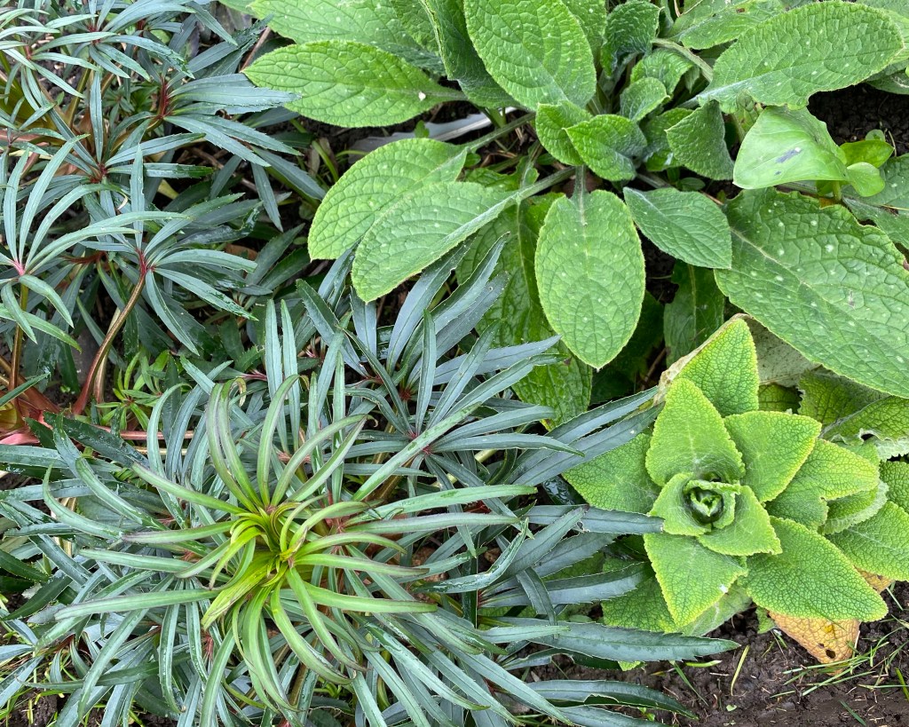 Pentaglottis sempervirens (Green alkanet), Helleborus foetidus (Stinking hellebore) and Digitalis purpurea (Fox glove).