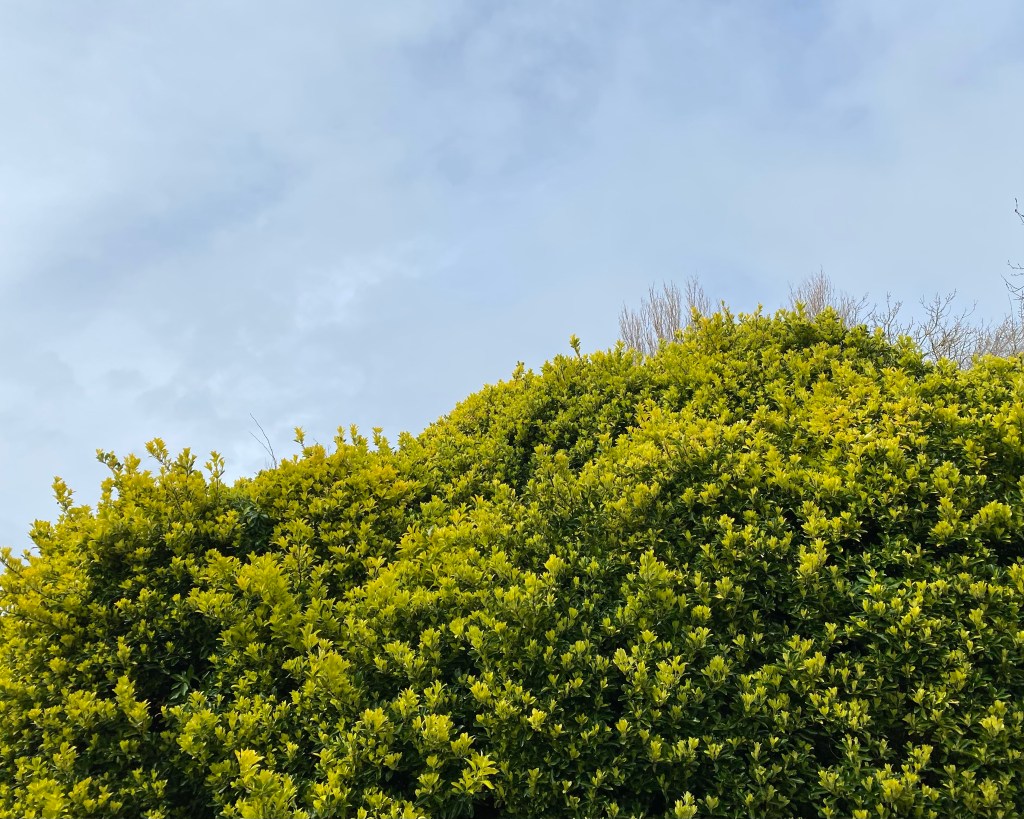 Perhaps an unremarkable plant, though robust and evergreen and rightly valued for that. But for a period at the end of March the new growth as it develops is an almost luminescent yellow against the mature green foliage. Easier to appreciate on a large specimen such as this one against the blue of the sky. Photo does no justice as is often the case.