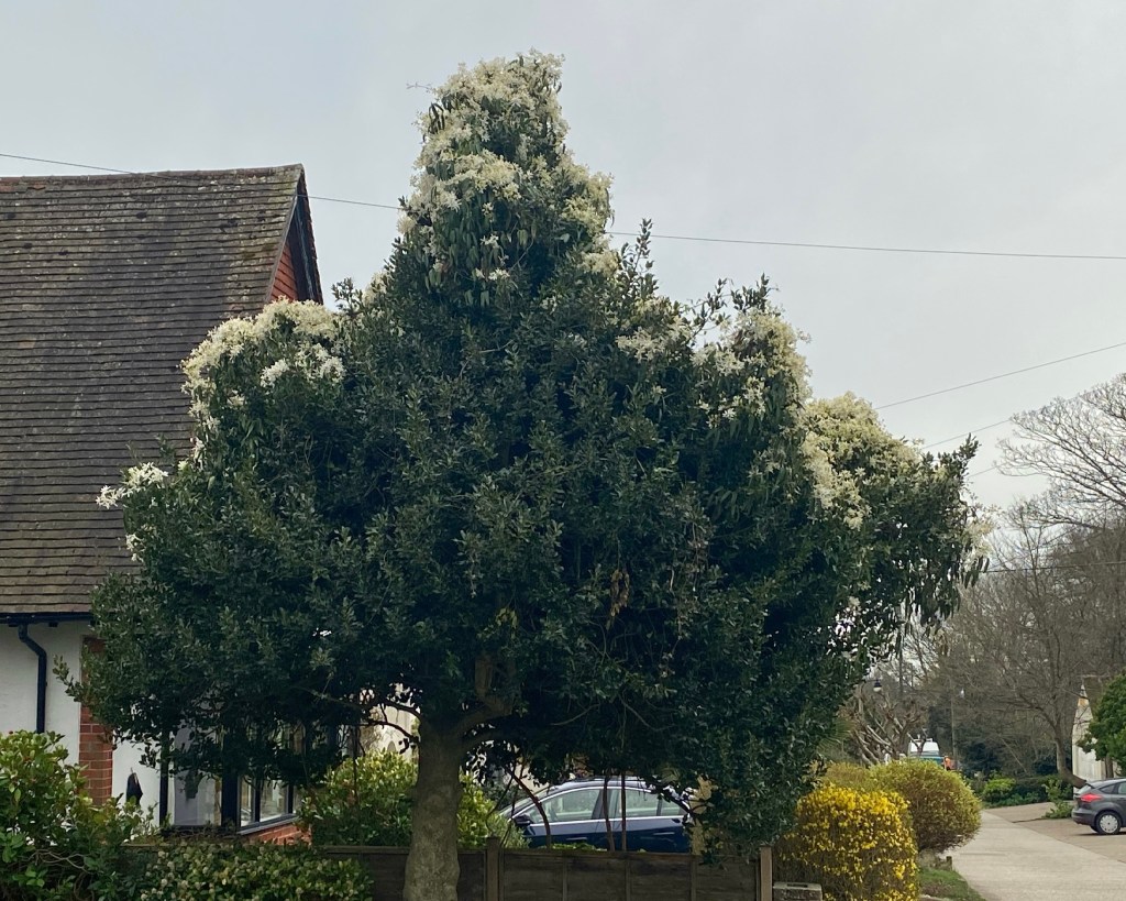 Two robust evergreens existing together, the climbing clematis in flower now at the beginning of April, with the Holly providing support.