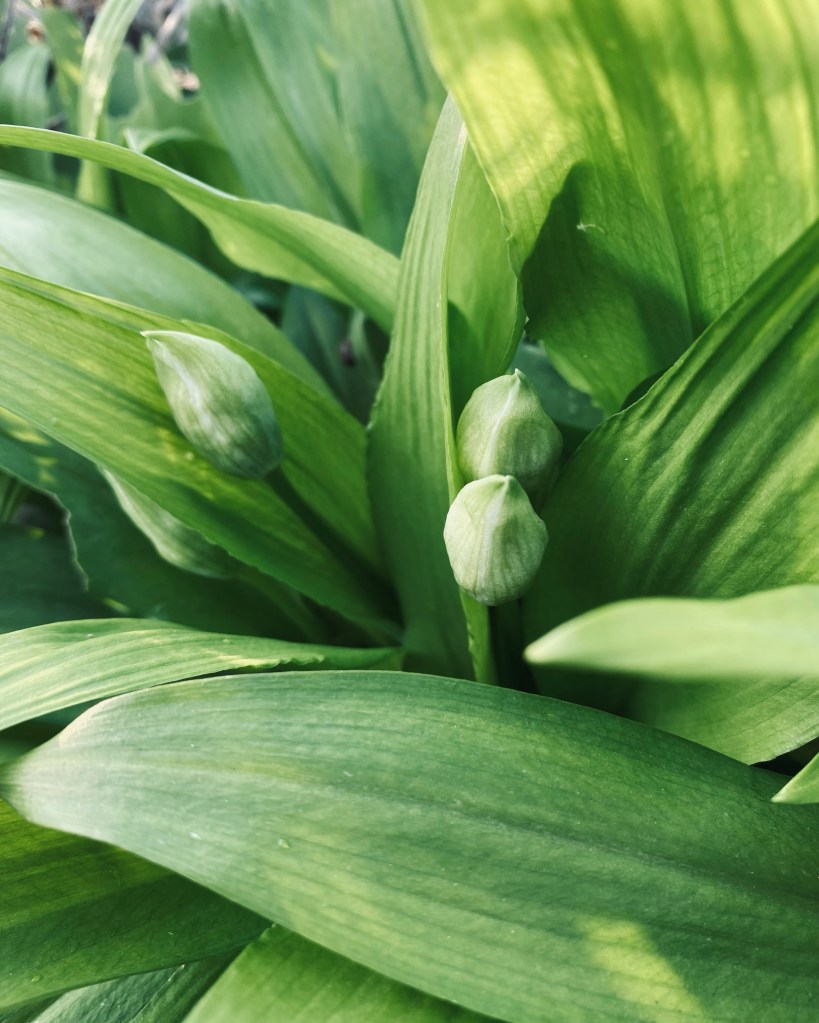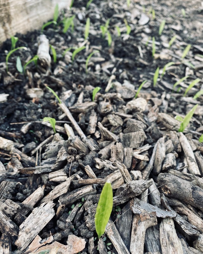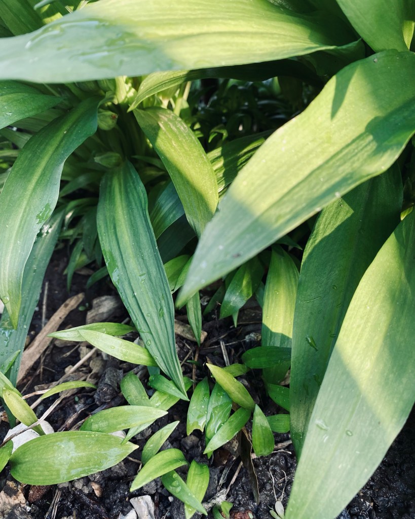 Below a one year old allotment colony established from 8 bulbs planted in the green. Seedlings germinating in the wood chip pathway. Happy days.