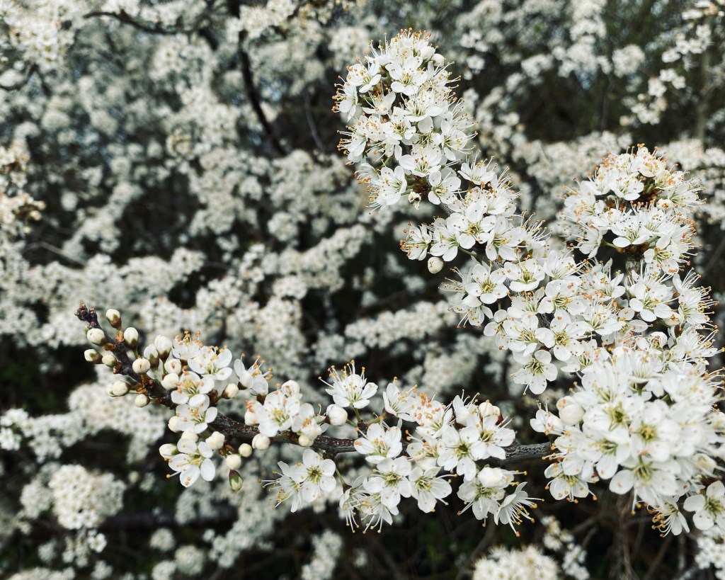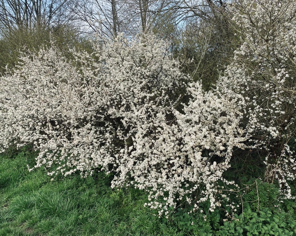 Sloe, aka Blackthorn, in blossom 3rd week of April (UK). Seen here naturalised in scrub on the edge of park land. Return in September to forage the berries.