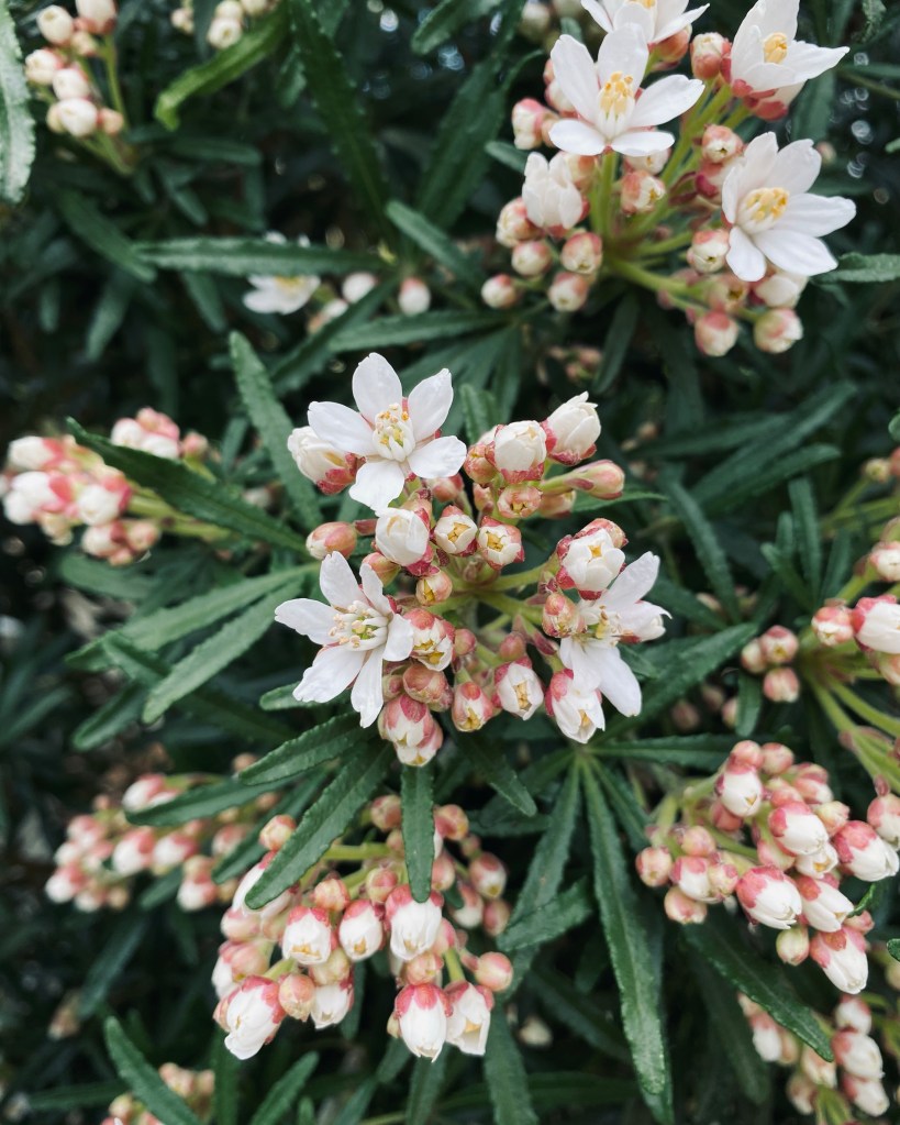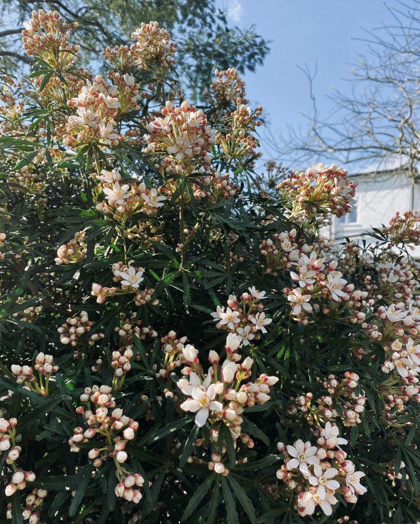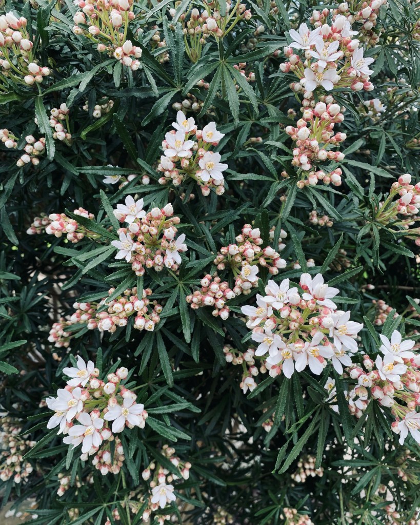 A compact and slightly more refined shrub than its popular half sister Choisya ternata and less prone to yellowing leaves. Still fragrant in flower and leaf which make it an ideal path side shrub as seen here. A second flowering is possible if pruned after the first flush of flowers has faded.