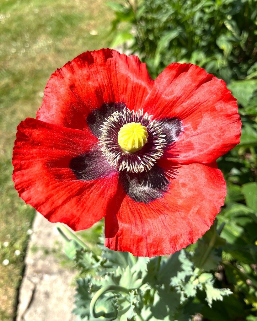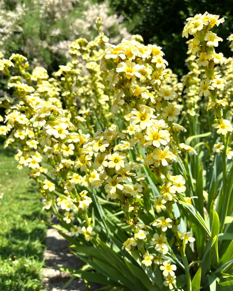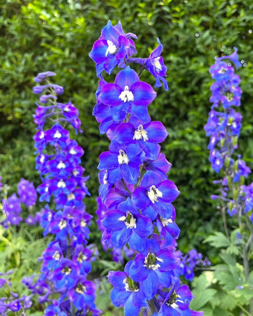 Perennial Delphiniums in bloom. Annual self seeded poppies, Papaver somniferum, flowering now along with self seeding evergreen perennial Sisyrinchium striatum.