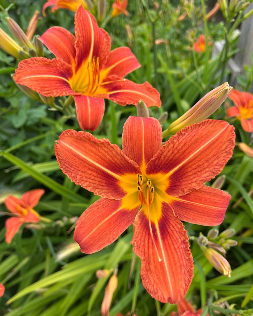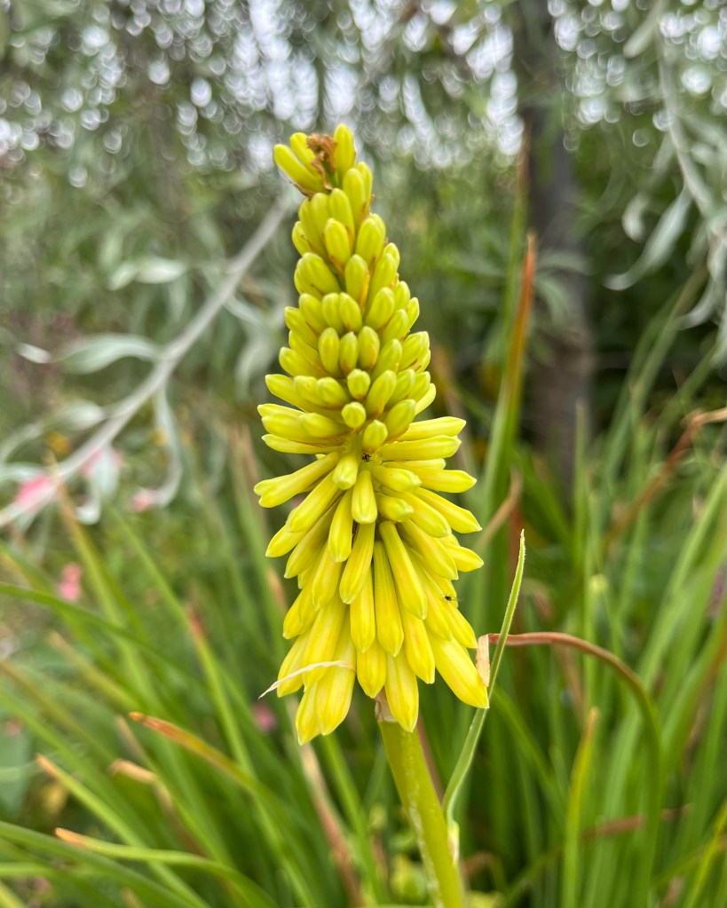 In flower Blue Spiderwort, Tradescantia virginiana, worth looking at; in leaf is unremarkable and can look tatty at times, but right now is the best of it and that’s the first picture. Second an unknown cultivar of Red Hot Poker, Kniphofia uvaria, that’s been here and there in the garden for 18 yrs. Lastly the most commonly seen Day Lily, Hemerocallis fulva (having a particularly good year), which also has many cultivars like the previous two, a plant that can take more than its fair share of the garden and is capable of elbowing out its neighbours.