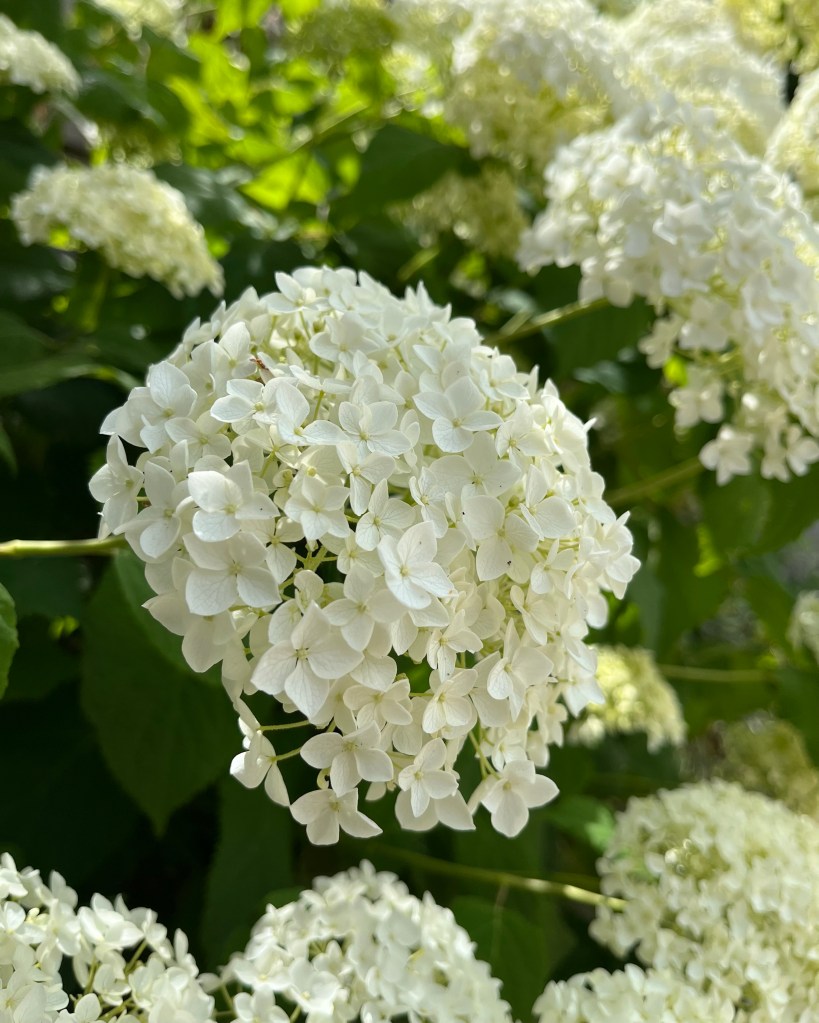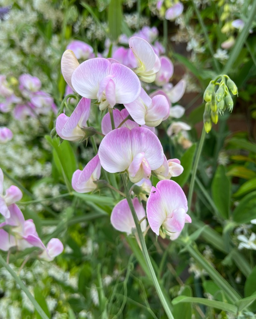 Hydrangea arborecens ‘Annabelle’, popular, good looking and easy going flowering now at the beginning of summer. The Everlasting Pea, Lathyrus latifolius, the perennial version of the annual sweet pea (although the flowers are not fragrant) flowering and growing strongly at this point in the season. Lastly the shade loving Hart’s-tongue fern, Asplenium scolopendrium, looking fresh with new leaves.