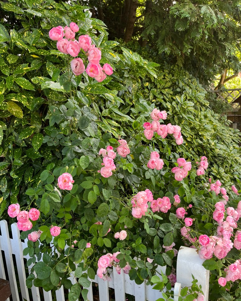 An enchanting rose stated as a procumbent (ground cover) rose by some and as a shrub rose by others. Bred by Kordes Roses (Germany) in 1936. Here seen in shade and as a shrub, albeit on the lean side. If it wasn’t for the fence offering a bit of support I could see it wanting to procumbere. Not especially fragrant which is a shame and not a repeat flowerer, but still wonderful nonetheless.