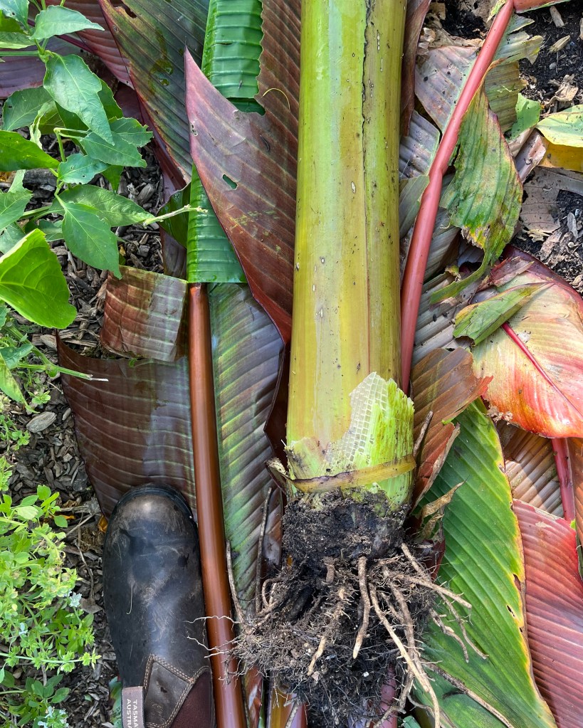 In one corner of the greenhouse this year I planted the tender exotic Ensete ventricosum ‘Maurelii’. With plenty of water and good rich soil it out grew its position in next to no time. The challenge now is to get it through the winter, as being completely tender it cannot stand any amount of cold. So I elected to cut it right back, lift it and begin to dry it for storage until temperatures next year are once again good for growth. It’s a case of fingers crossed and see you on the other side.