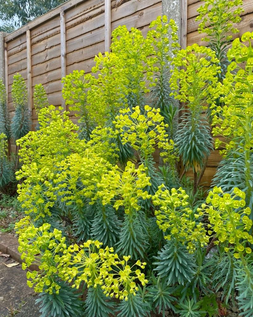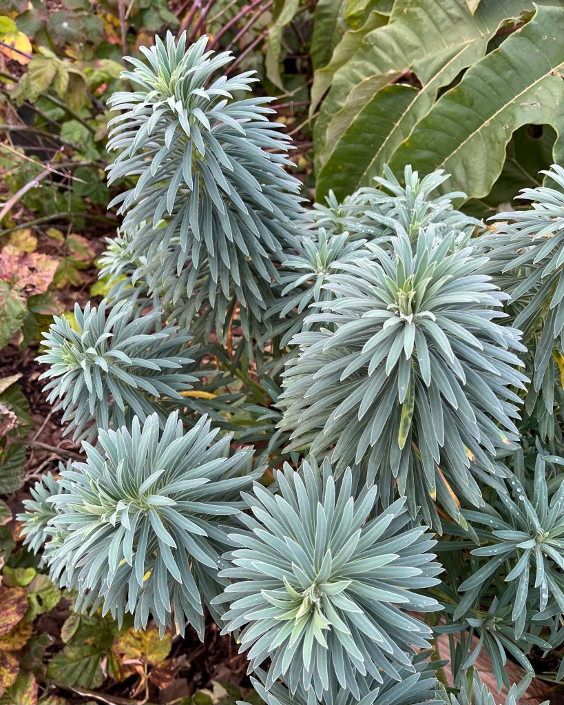 Is Euphorbia characias subsp. wulfenii under appreciated on account of its ubiquity and its habit of being quiet during the summer? It instead chooses to display when few are looking, with first rate foliage in late November prior to the beginning of winter when the days are short and most folks are inside and then in late March with acid green flowers when the daffodils are stealing the show. You would think that choosing to look good at a time when many others don’t is a good popularity strategy that’s bound to work on gardeners intent on prolonging the season but in reality this can make the plant hard to use in a mixed or herbaceous border context, many times finding itself without a contrasting complimentary partner and surrounded by plants that have peaked long ago. Below two photographs from late November (leaf) and late March (flower) separate locations but same species.