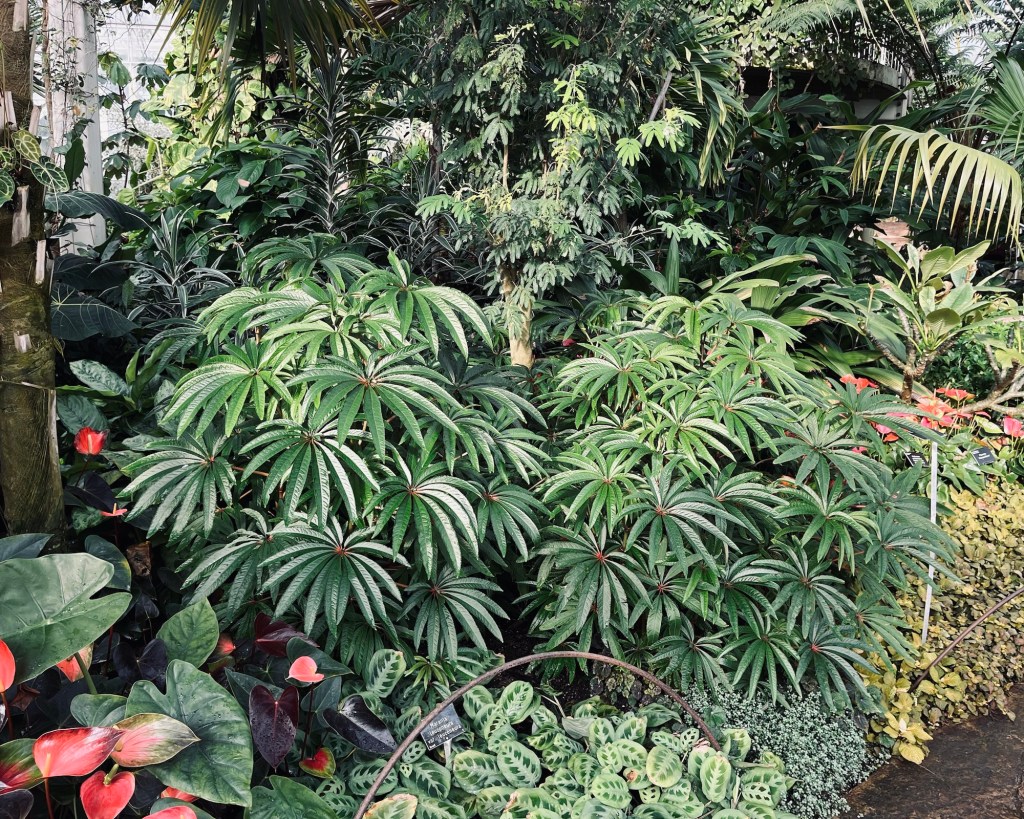 The begonias are a diverse group and Begonia luxurians illustrates that well, not really meeting your expectations of what a begonia should be. Instead, at first glance, it’s looking more like some kind of shrubby palm – the usual give away, the asymmetrical leaf, not nearly so obvious. Seen here enjoying the Tropical Zone of the glasshouse at RHS Wisley in Surrey to which it is perfectly suited.