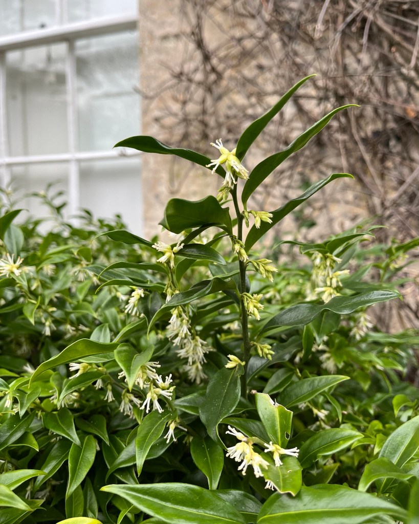 Evergreen winter flowering fragrant shrub ideally placed somewhere near the front door in partial shade so as to appreciate the fragrance as you come and go in January/February. Native to China and a member of the Box family, Buxaceae.