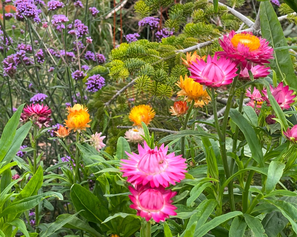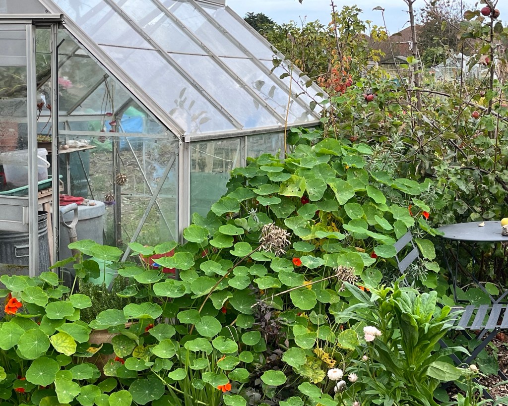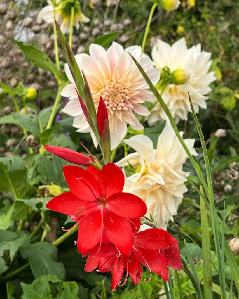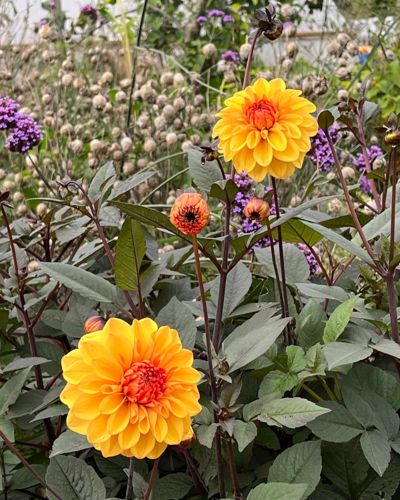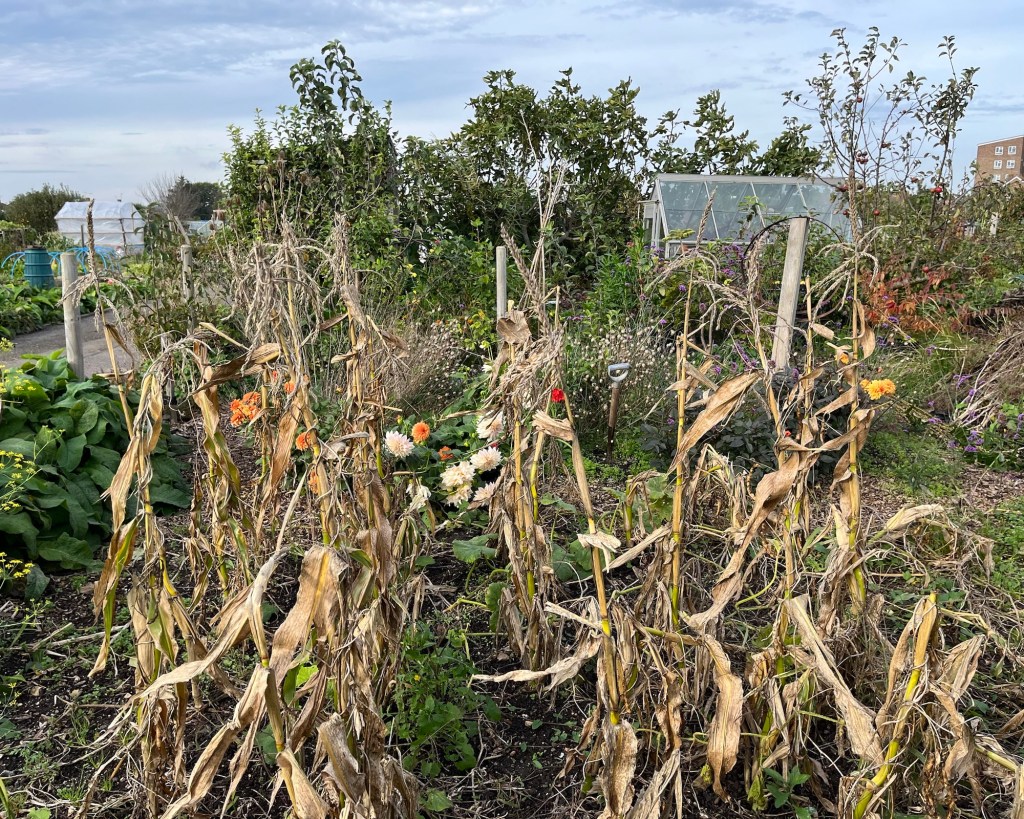 I never intentionally brought in nasturtiums (Tropaeolum majus), arriving on their own somehow, but now each year they successfully swallow the plant bench here and attempt the same on the greenhouse. I thin them quite hard during the summer as they germinate, but by September their vigour is such that I just leave them alone. The garden in September is to be celebrated for its fullness of growth and it’s a time when I begin to relax about tending it and really enjoy the time spent. And so into October and there’s still plenty of colour with many plants flourishing in the mild and moist prospect that the month offers. Check out the dahlias (David Howard, Cafe au lait) never happier than now, Verbena bonariensis and Helichrysum bracteatum continue in flower without hesitation and the crimson of Hesperantha coccinea ‘Major’ is making a welcome appearance now. The mint between the shed and the roadway cut back in late August is fresh and harvestable once again. Curiously a small willow defoliated late September, its stem colour vibrant against a backdrop of green. Nigella damascena, having spilled its seed in August, begins its next cycle, although many of the seedlings will be weeded out or culled by winter weather. There are also browns appearing here and there, most notably the sweetcorn planting which I’ve not been in a rush to clear away this year.