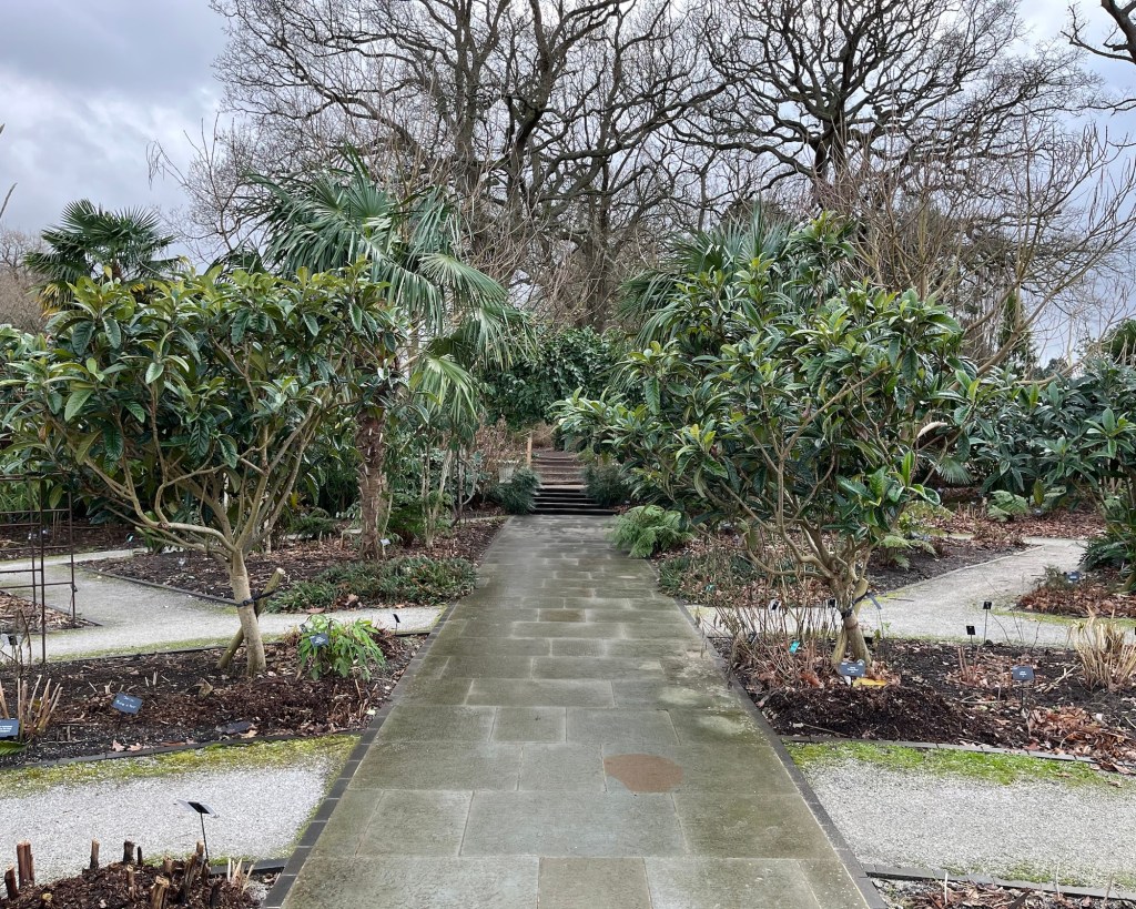 The Exotic Garden at RHS Wisley seen here looking up the central path and down the central path in late January.